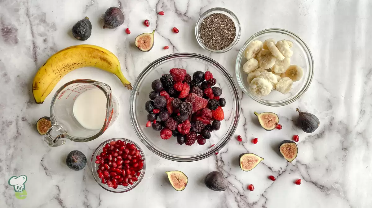 Smoothie bowls are best enjoyed immediately to maintain their thick, spoonable consistency. However, you can prep the "berry base" by blending the frozen fruit and milk and storing it in a sealed container in the freezer for up to 24 hours; just let it sit at room temperature for 5 minutes before adding toppings. Store fresh toppings like sliced figs and pomegranate seeds separately in the refrigerator to keep them crisp.